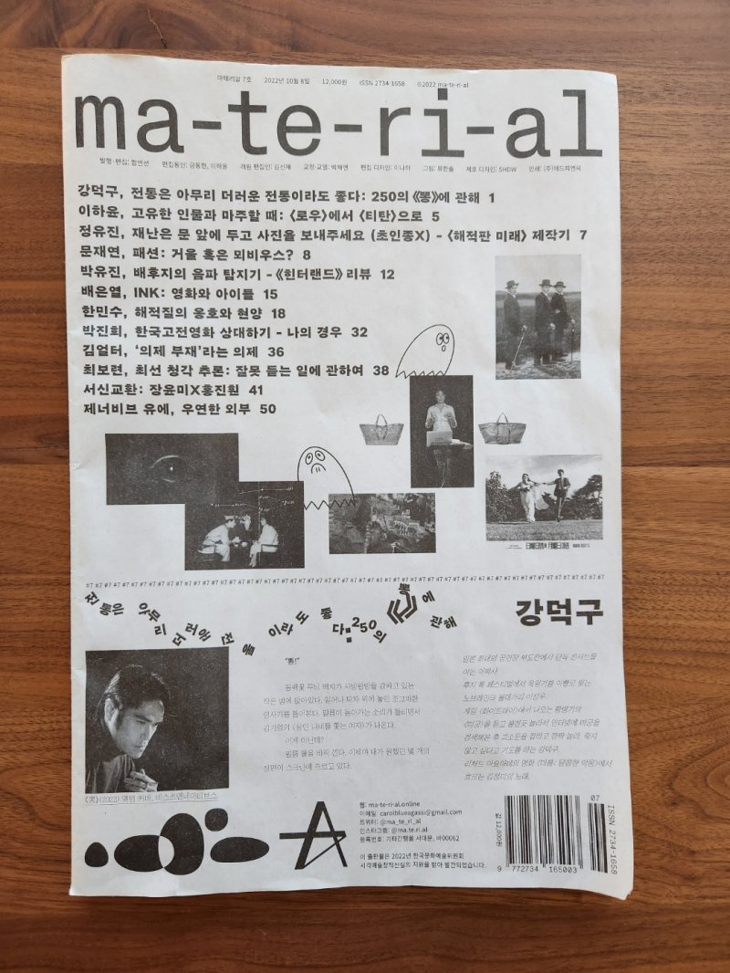 최근 내가 운영하는 책방 노마만리를 방문한 한민수씨가 자신의 글이 실린 마테리알 7호를 선물해, 이 글을 읽게 됐다. 그전까지 나와 그는 일면식도 없는 관계였다. 같은 지역에 영화연구자가 운영하는 책방이 있다는 소식을 듣고 찾아와, 그 주인장에게 자신의 글이 실린 잡지를 기증하며 새로운 관계가 형성된 것이다. 이는 책방 주인과 손님이라는 관계를 뛰어넘는, 영화로 얽힌 동지애 같은 것이리라.