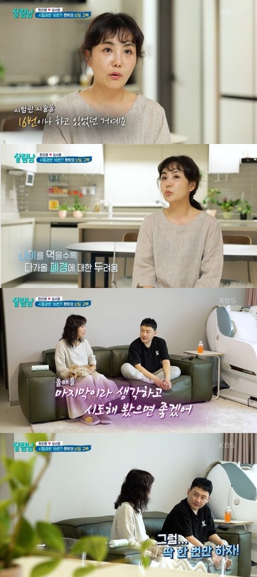 지난 8일 방송된 KBS 2TV 예능물 '살림하는 남자들 시즌2'에서 현진영, 오서운 부부가 마지막 시험관시술에 도전하기로 결심한 내용이 그려졌다. 오서운은 현진영에게 "그동안 우리가 시험관 많이 했지만 이번이 마지막이라고 생각했으면 한다. 나는 많이 아쉽다"라고 했다.