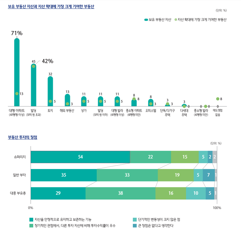 자산 확대 기여도가 가장 높은 부동산은 50억원 이상의 빌딩(42%)이었다. 슈퍼리치들이 부동산에 투자하는 주 이유는 ‘자산의 안정적 유지와 보존(54%)’으로 조사됐다.