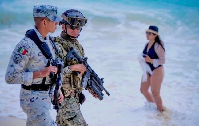 [서울=뉴시스]권서영 인턴 기자 = 신혼여행지로 유명한 멕시코의 칸쿤에서 수영복을 입은 관광객과 군인들이 함께 포착되는 등 이색적인 풍경이 연출됐다.