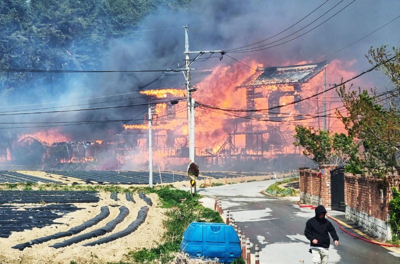 11일 오전 8시 22분쯤 강원 강릉 난곡동의 한 야산에서 발생한 산불이 민가로 확산, 한 주택이 불에 휩싸여 있다. 소방당국은 소방 대응 3단계를 발령하고 최고수위의 진화 작업을 펼치고 있다. 2023.4.11/뉴스1 ⓒ News1 윤왕근 기자