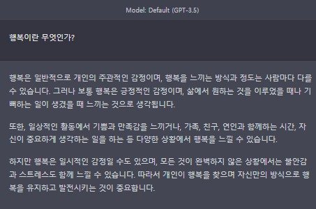단순히 "행복이란 무엇인가"를 입력하면 사전적 정의를 포함한 일반적인 답이 나온다. 대신 "행복이란 무엇인가. Let's think step by step"이라고 입력하면 행복과 만족의 차이, 행복을 느끼는 상황 등 인간 생활에 근거한 촘촘한 답변이 나온다.