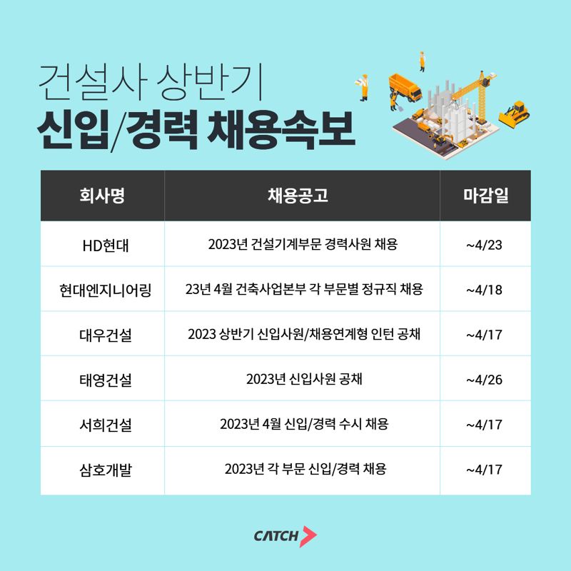 12일 취업 콘텐츠 플랫폼 진학사 캐치에 따르면 HD현대와 현대엔지니어링, 대우건설, 태영건설, 서희건설, 삼호개발 등이 채용을 진행 중이다.