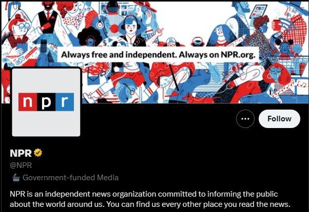 NPR은 또 트위터 계정의 회사소개란에 "NPR은 우리 주변의 세계를 대중에게 알리기 위해 헌신하는 독립적인 뉴스 기구다. 뉴스를 읽는 다른 모든 곳에서 우리를 찾을 수 있다"고 업데이트했다.