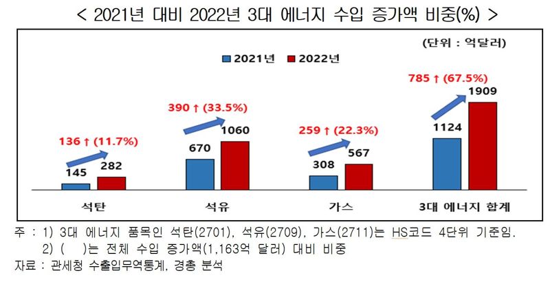 특히 높은 에너지가격 상승이 우리나라 수입단가 상승에 크게 영향을 미친 것으로 나타났다. 석탄·석유·가스 등 3대 에너지의 지난해 수입액은 2021년 대비 785억달러 늘었는데, 수입물량은 3.2% 늘어난 반면 수입단가는 64.5%나 상승한 것으로 집계됐다. 이에 따라 지난해 3대 에너지 수입 증가액(785억 달러)은 우리나라 전체 수입 증가액(1163억 달러)의 67.5%에 이른 것으로 나타났다.