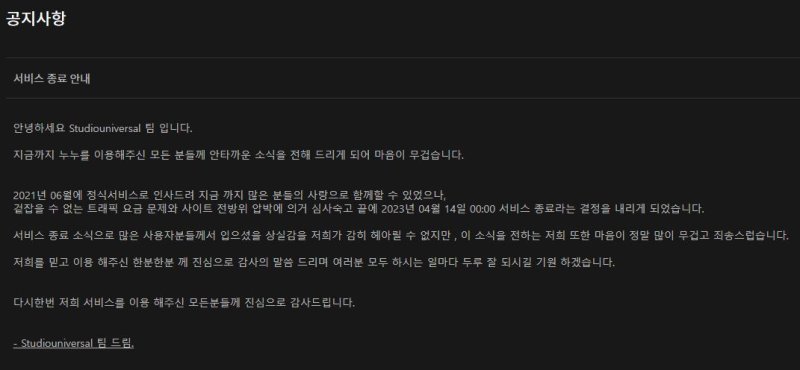 누누티비가 지난 13일 오후 공지사항을 통해 서비스를 종료한다고 밝혔다.
