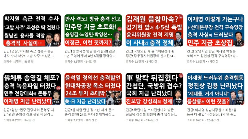 또 특정 시기 주요한 정치 이슈 및 정치인을 다룬 영상의 조회수가 대체로 높았다. 예컨대 지난 2019년 '진성호 방송'이 올린 김건희 여사 관련 영상은 조회수 450만회를 돌파했으며, 2021년 '배승희 변호사'의 제20대 대통령 선거 후보 예측 영상은 조회수 약 303만회를 기록했다.