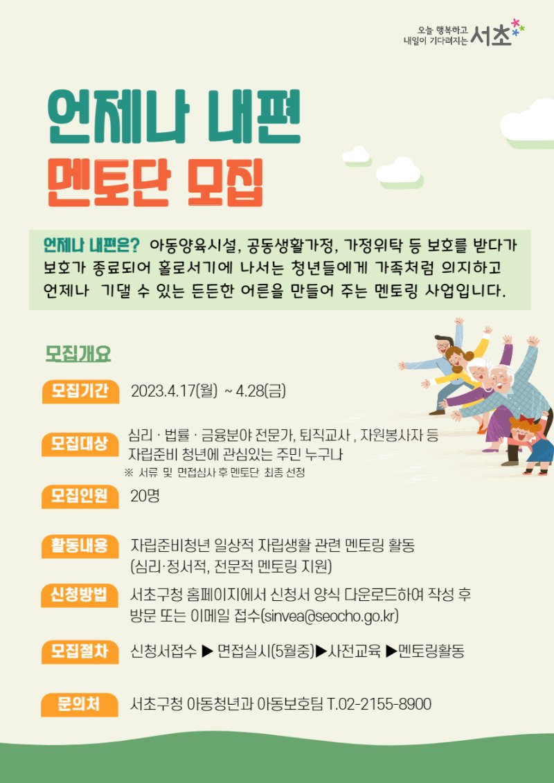 멘토 모집은 오는 28일까지며 관심 있는 구민들은 서초구 누리집을 통해 신청하면 된다. 향후 구는 서류·면접 심사를 거쳐 최종 멘토를 선정, 다음 달에 발대식을 열고 멘토링 활동을 지원할 예정이다.