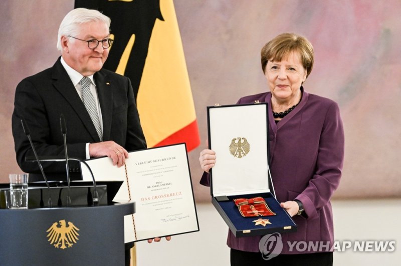프랑크-발터 슈타인마이어 독일 대통령은 이날 벨뷔궁에서 메르켈 전 총리에게 독일 특별공로 대십자 훈장을 수여했다.