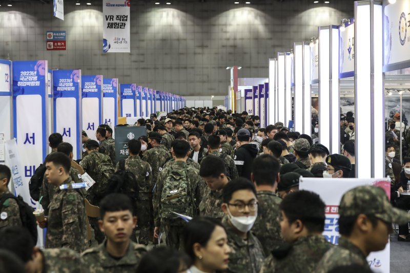 [고양=뉴시스] 김근수 기자 = 국군 장병들이 18일 경기 고양시 킨텍스에서 열린 2023년 전반기 국군장병 취업박람회에서 일자리를 알아보고 있다. 2023.04.18. ks@newsis.com [서울=뉴시스] 류현주 기자 = 2023년 전반기 국군장병 취업박람회가 18일 경기 고양시 일산 킨텍스와 공식 누리집에서 온·오프라인 방식으로 개최했다.