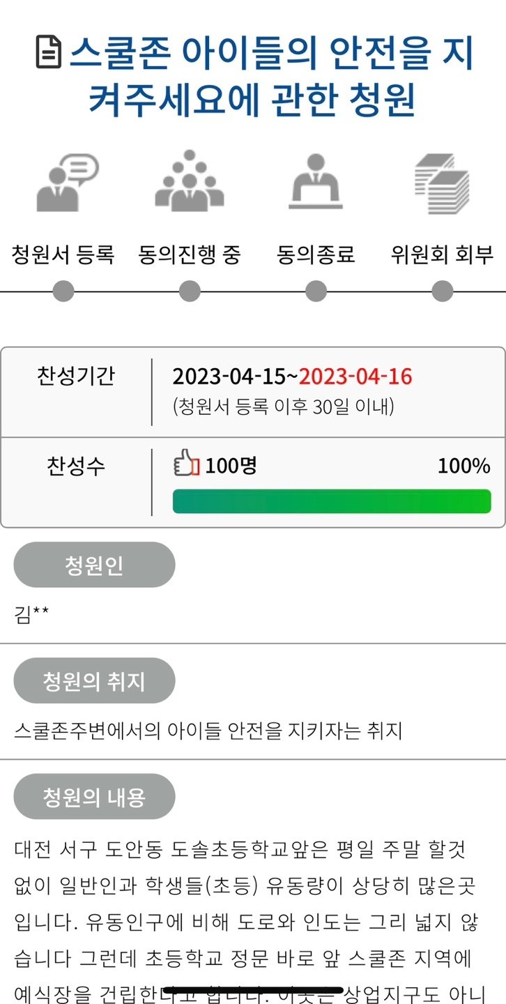 김씨는 도솔초등학교 스쿨존 주변에서의 아이들 안전을 지키자는 취지로 청원했다.