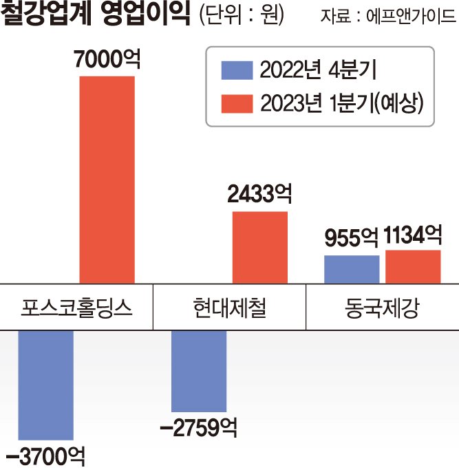 18일 업계에 따르면 포스코홀딩스는 올해 1·4분기 7000억원의 잠정 영업이익을 달성해 흑자전환에 성공했다. 지난해 4·4분기 3700억원의 영업손실을 기록했던 것과 대조되는 실적이다. 금융정보업체 에프엔가이드에 따르면 현대제철 역시 올해 1·4분기 2433억원의 영업이익이 전망돼, 2759억원의 영업손실을 기록했던 작년 4·4분기보다 실적이 나아질 것으로 보인다.