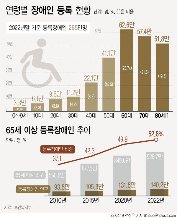 65세 이상 등록장애인의 추이를 보면 2010년 93만4634명(37.1%)→2015년 105만3364명(42.3%)→2020년 131만4625명(49.9%)→2022년 140만1523명(52.8%)으로 고령층 비율이 증가하고 있으며 지난해 처음으로 50%를 넘어섰다.