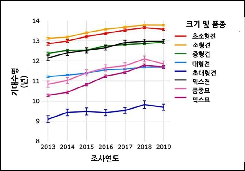 모든 조사 기간에 걸쳐 반려견의 평균 기대수명은 12.69세, 반려묘는 11.18세로 나타났다. 반려견과 반려묘 모두 2013년부터 2018년까지 기대수명은 꾸준히 증가했다. 반려견의 기대수명은 크기에 따라 다양했는데, 소형견이 13.53세로 기대수명이 가장 길었고, 초소형견(13.36세)믹스견(12.71세), 중형견(12.7세), 대형견(11.51세), 초대형견(9.51세) 순으로 나타났다. 반려묘는 믹스묘(11.12세)가 품종묘(11.54세)보다 짧았다.
