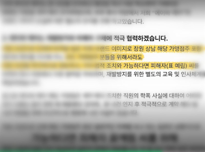 가해자 A 씨가 채용된 배경을 두고는 "해당 가맹점주가 학폭 사실에 대해 어떤 과거 사항도 알지 못한 채 채용했다"며 "이번 사건으로 가맹점주가 일방적인 피해를 보고 있으니 무리한 비방은 삼가달라"고 호소했다.