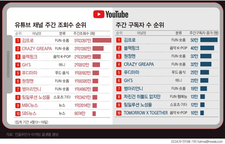 주간 구독자수, 김프로·블랙핑크·원정맨 順