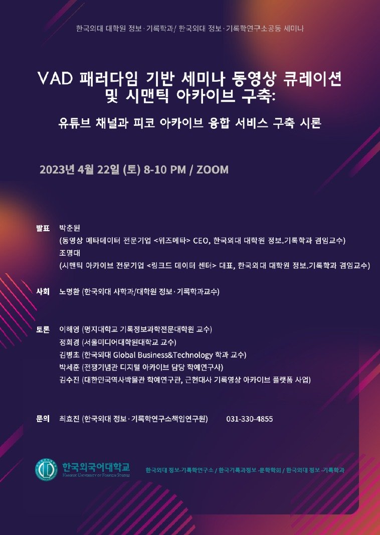 (서울=뉴스1) 서한샘 기자 = 한국외대 정보·기록학연구소는 한국외대 일반대학원 정보·기록학과와 오는 22일 'VAD 패러다임 기반 세미나 동영상 큐레이션 및 시맨틱 아카이브 구축'을 주제로 온라인 화상 세미나를 개최한다.