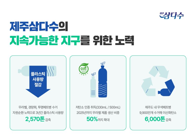 제주삼다수는 무라벨 제품 '제주삼다수 그린' 생산량을 늘리고 제품 경량화를 추진해 생산 단계에서 플라스틱을 감축하고자 노력했다. 이와 동시에 투명 페트병 회수 등의 다양한 자원순환 노력으로 지난 3년간 플라스틱 사용량 약 2570톤을 감축했다. 이를 통해 2020년 대비 플라스틱 사용량을 약 9% 절감했다.