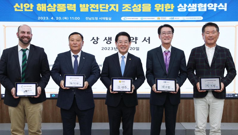 전남도는 20일 도청에서 신안군, 신안군어업인연합회, (사)신안해상풍력발전사협의체, 신안부유식풍력산업협회와 함께 어업인 권익 증진, 해상풍력과 수산업 공존을 위한 신안 해상풍력 발전단지 조성 상생협약을 했다.