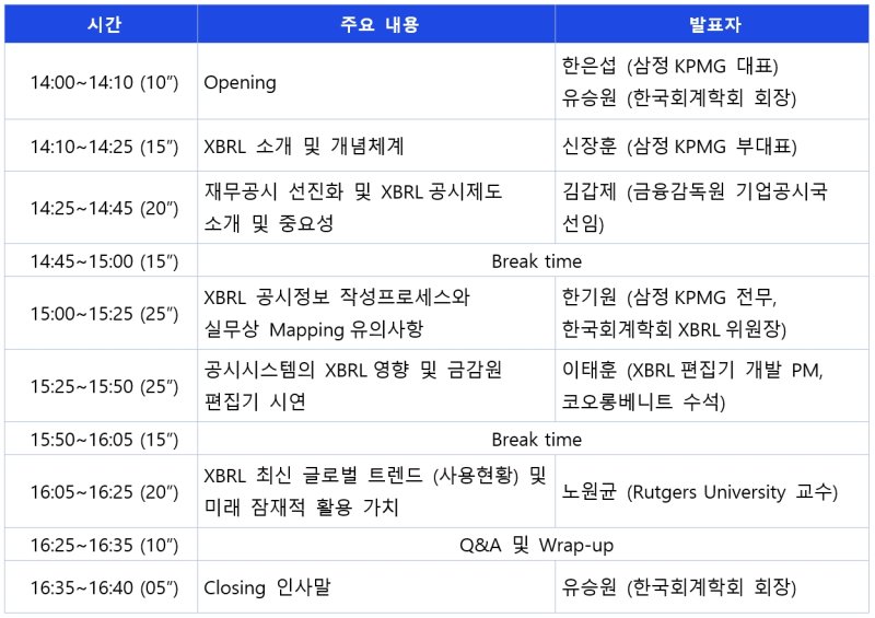 삼정KPMG와 한국회계학회는 오는 28일 안암동 고려대학교에서 국내 기업 대상 'XBRL과 재무공시 선진화 세미나'를 현장 및 온라인 생중계를 통해 이원으로 개최한다고 밝혔다.