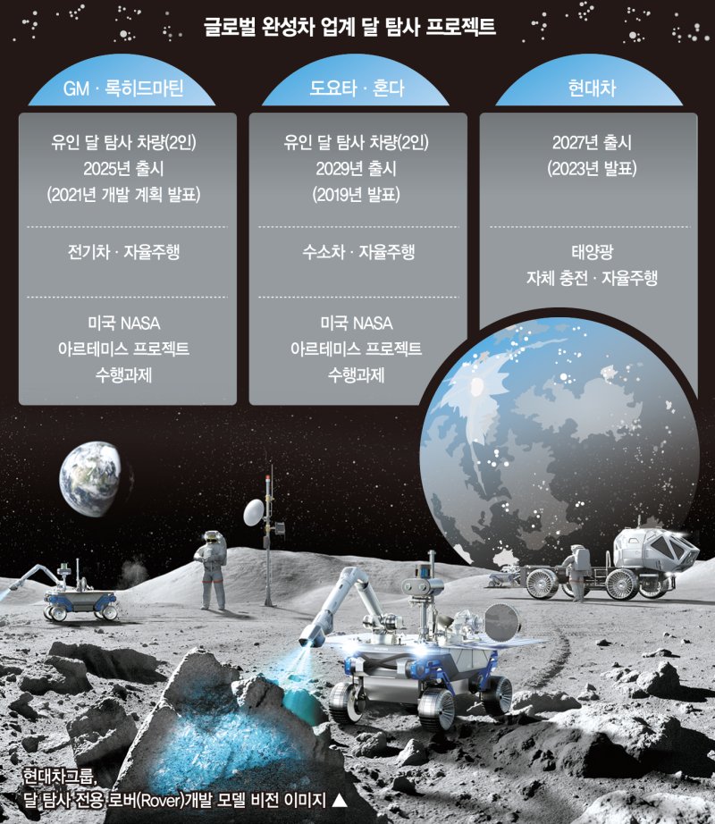 이미 글로벌 완성차 업계는 극한의 환경인 달에서 달리는 달 탐사선 개발에 착수했다. GM은 록히드마틴과 함께 2025년을 목표로 유인 달 탐사차량(자율주행·전기차)을 개발 중이다. 일본 도요타·혼다는 일본우주항공연구개발기구(JAXA)와 함께 수소연료전지를 기반으로 한 유인 자율주행 달 탐사차량을 연구하고 있다. 당초엔 4인승을 계획했으나 현재는 2인승으로 개발 중인 것으로 파악됐다. 한국보다 앞선 2019년 개발을 선언했지만 출시 시점은 2029년이다. 양측 모두 미국항공우주국(NASA) 주도로 21개국이 참여하는 국제 달탐사 프로젝트인 아르테미스의 일환이다. 현대차그룹은 달 탐사차량 개발을 통해 탐사로봇, 자율주행, 선진항공교통(AAM) 등 관련 기술이 시너지를 낼 수 있을 것으로 기대하고 있다.