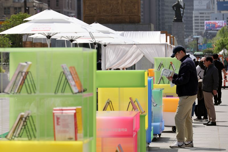 세계 책의 날인 23일 서울 광화문광장을 찾은 시민들이 읽을 책을 고르고 있다. 서울시는 23일 부터 11월까지 광화문광장과 서울광장에 각각 '광화문 책마당'과 '책읽는 서울광장'을 운영한다. 사진=서동일 기자