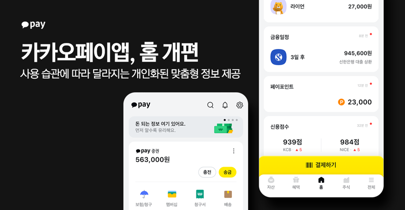 24일 금융권에 따르면 카카오페이(대표 신원근)는 사용자들이 ‘나’에게 가장 필요한 서비스와 정보를 더 빠르고 편리하게 이용할 수 있도록 카카오페이앱 홈 화면을 개편했다. 사용자마다 자신만의 UI(user interface)를 경험할 수 있었던 기존 카카오페이앱의 장점은 살리되, 데이터 분석과 사용자 피드백을 반영해 편의성을 높인 게 특징이다.