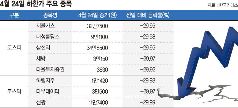 24일 한국거래소에 따르면 이날 코스피시장에서 대성홀딩스, 세방, 삼천리, 서울가스, 다올투자증권이, 코스닥시장에서는 선광, 하림지주, 다우데이타가 일제히 하한가로 추락했다.