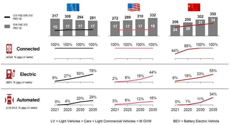 CASE 확산이 가장 빠른 유럽 기준 2025년이면 신차 연결성 100%, 전기차 27%, Level 3 이상 자율주행 차량이 4% 수준으로 보급될 것이란 판단도 나왔다. 이 같은 변화가 모빌리티 시장에서 전통적 가치 창출 수단인 ‘완성차 판매’라는 틀을 넘어서는 계기로 작용한단 분석이다.
