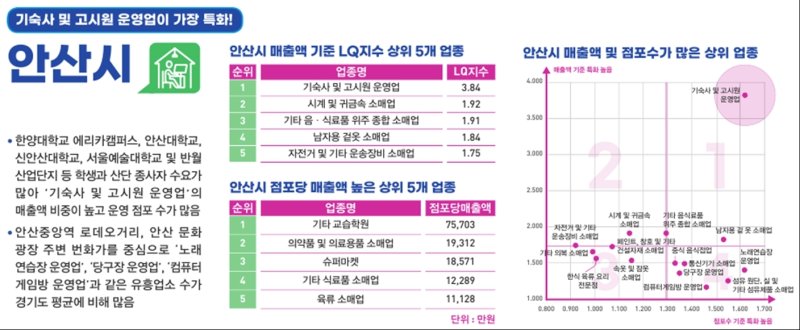 이는 반월 산업단지, 한양대학교 에리카캠퍼스 등 산업단지 근로자와 대학생 수요가 높은 영향으로 파악된다. 뒤를 이어 '식료품 및 의류 관련 업종'들도 활성화 중으로 분석되었는데, 이는 과천, 광명, 안양을 중심으로 주거지역이 넓게 형성된 영향으로 분석됐다.