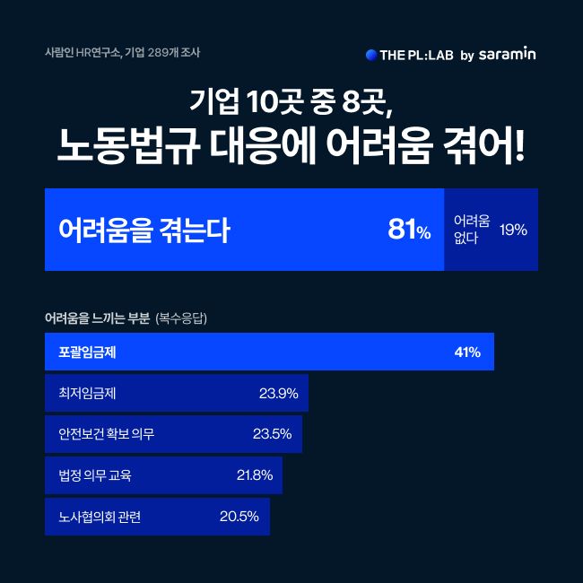 최승철 사람인 HR연구소장은 "기업들이 대·중소기업을 가리지 않고 현행 노동 법규에 어려움을 겪고 있음을 확인했다"며 "전문가 자문과 교육, HR 솔루션을 적극 활용할 필요가 있다"고 말했다.