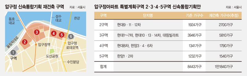 현재 압구정아파트지구는 6개 특별계획구역으로 나뉜다. 이중 2~5구역만 2021년 12월부터 신통기획에 참여하고 있다. 기존 4개 구역(면적 70만6561㎡)에 포함된 아파트는 19개 단지, 총 8443가구다. 신통기획안에 따라 총 약 1만1840가구로 탈바꿈하게 된다. 다만, 가구 수는 주민들이 설계자 선정 뒤 설문조사 통해 평형 수요를 고려해 바뀔 수 있다.