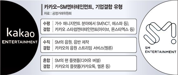 예를 들어 가수 매니지먼트 분야에서는 수평결합이, SM의 음원·음반 제작 분야는 카카오의 음원 스트리밍 서비스(멜론)와 수직결합을 이룬다. SM 팬 플랫폼인 디어유 버블은 카카오톡, 멜론 등 카카오의 플랫폼 사업과 혼합결합 형태로 심사될 수 있다. 이 외에도 다양한 사업에서 여러 형태의 결합이 예상되고, 시장경쟁 제한성을 따질 항목도 많아질 것으로 전망된다.