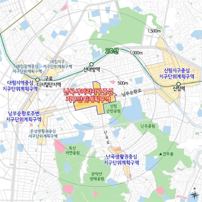 서울 관악구 서측에 위치한 난곡사거리지구중심은 관악구의 주요 교통축인 남부순환로에 위치해 있다. 가산·대림광역중심과 봉천지역중심 등 서남권 주요 중심지와의 접근성이 좋고, 향후 난곡선 개통 시 여의도 도심과의 접근성도 향상될 예정으로 입지적 경쟁력이 풍부한 지역이다. 시는 이 같은 잠재력을 바탕으로 지구중심의 자족도시기능 강화 및 난곡선 예정 역세권 활성화를 위해 지구단위계획 재정비를 추진했다는 설명이다.