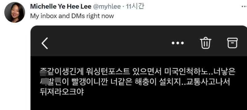 지난 24일 윤 대통령의 미국 방문을 앞두고 단독 인터뷰한 한국계 미국인 미셸 예희 리 WP 도쿄 서울지국장은 26일 밤 자신의 트위터에 "지금 이런 문자를 받았다"며 원문과 보낸 이 이름을 그대로 공개하는 것으로 분노를 표출했다.