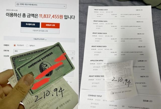 [파이낸셜뉴스] 연소득이 최소 1억원 이상되어야 발급되는 ‘아메리칸 익스프레스 카드’를 온라인커뮤니티에 자랑한 A씨가 10분 만에 1200만원의 대금을 내게 됐다. 사진을 올리면서 신용카드 번호를 가리지 않은 게 화근이었다.