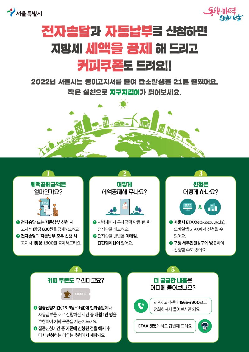 그간 서울시는 '종이 없는 고지서'를 세무행정의 목표로 탄소중립 및 ESG 경영을 실천하고 시민의 납세 편의를 위해 고지서 전자송달과 자동납부 서비스를 제공해왔다. 시는 올해 온실가스 30톤 감축을 목표로, 5월부터 11월까지 전자송달·자동납부 집중신청기간으로 지정·운영한다는 방침이다.