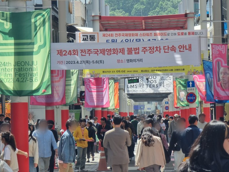 이날 오후 찾은 전주시 고사동 영화의거리 일대는 차량 통행이 통제돼 여유를 즐기며 걷는 사람들로 가득 차 있었다. 이팝나무 꽃이 만개한 오거리 광장에 마련된 야외 토크 스테이지에서는 노재원·박정연·유의태·이유지·한동희 배우가 영화 팬들을 직접 만났다. 자리에 앉은 시민들은 무대 위 배우들의 재치 있는 입담에 폭소를 터뜨리기도 했다.
