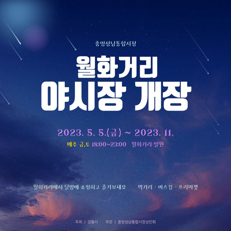 야시장 개장식은 특색있는 야시장 운영을 통해 주변상권의 상생 발전과 영세소상공인과 청년들의 자생력 회복 및 강화를 도모하기 위해 강릉시와 중앙·성남통합상인회가 함께 추진한다.
