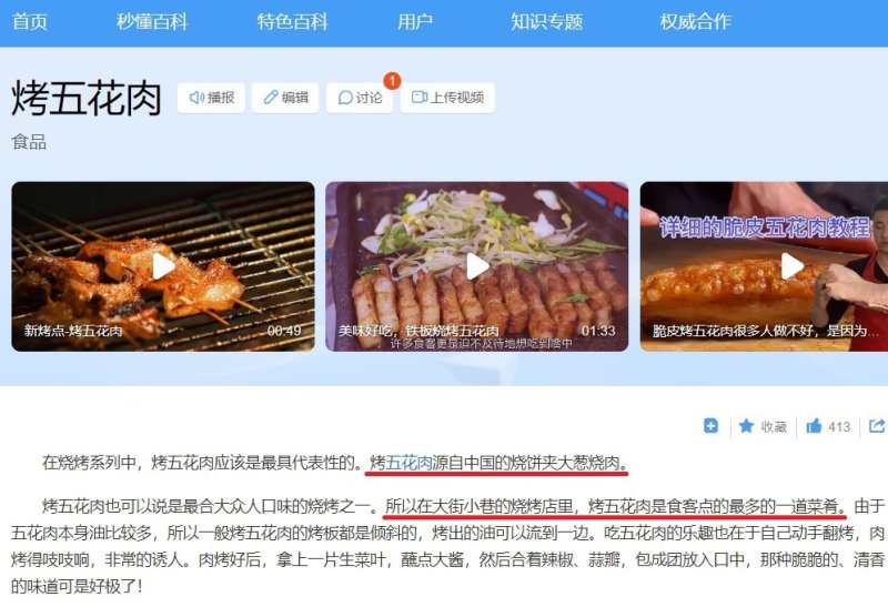 최근 바이두에서 삼겹살을 검색하자 '고오화육(五花肉)'이라는 설명과 함께 "삼겹살 구이는 중국식 전병에 싸 먹는 '대파 돼지고기볶음'에서 유례한 음식"이라고 나왔다. "삼겹살은 중국의 최고 요리 중 하나", "골목길에 들어가도 삼겹살 구이를 쉽게 볼 수 있을 정도로 대중적" 등의 설명도 보였다.