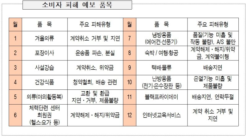 이번에 선정한 피해 예보 품목은 1월 겨울의류, 2월 포장이사, 3월 사설강습, 4월 건강식품, 5월 야외활동복, 6월 체력단련회원권, 7월 냉방용품, 8월 숙박·여행·항공, 9월 택배·물류, 10월 난방용품, 11월 블랙프라이데이, 12월 인터넷교육서비스 등이다.