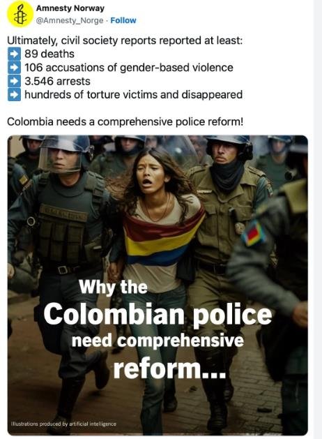 국제앰네스티, '콜롬비아 시위 진압' AI 사진 게재 논란콜롬비아 반정부 시위 2주년 기념 보고서 홍보 차원