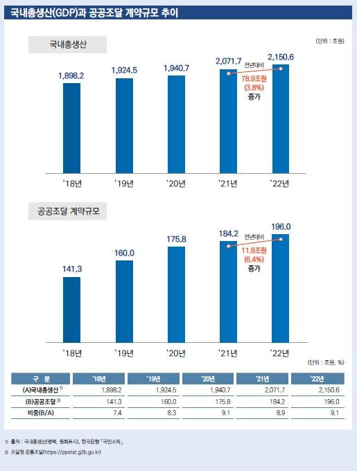 3일 조달청이 발간한 '2022 공공조달통계연보'에 따르면 지난해 공공조달 전체 계약규모는 196조원으로 전년 184조2000억원 대비 11조8000억원(6.4%) 증가했다.