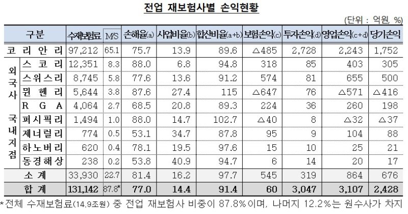 수재보험료를 기준으로 한 전업 재보험사의 시장점유율은 87.8%로 집계됐다. 회사별로는 코리안리 65.1%, 스코리 8.3%, 스위스리 5.8% 등의 순이다.
