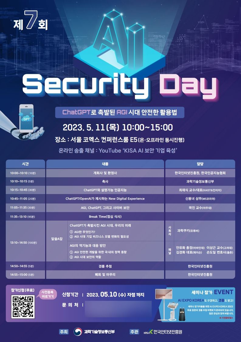 이번 세미나는 AI 및 보안 산업 관계자뿐만 아니라 AI에 관심 있는 국민 누구나 참여가 가능하며 온·오프라인으로 동시 진행될 예정이다. 또한 국제인공지능대전(AI EXPO KOREA 2023)도 함께 개최돼 더욱 유익한 정보와 다채로운 볼거리도 제공된다.