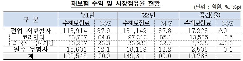 재보험을 인수한 회사가 피인수 회사에서 받는 재보험료를 의미하는 수재보험료는 지난해 총 14조9311억원으로 전년 대비 15.3%(1조9766억원) 증가했다. 공동재보험 거래와 보험회사 신지급여력제도(K-ICS) 등에 대응하기 위해 재보험 활용이 증가한 영향이다.
