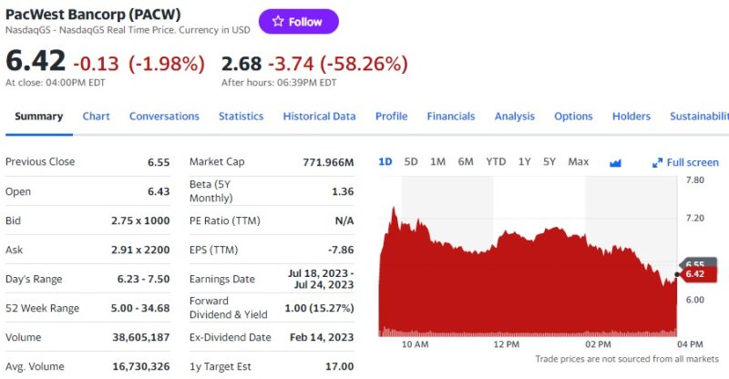 이 은행은 지난 3월 8일 실리콘밸리은행(SVB)발 은행위기가 시작된 이후 주가가 거의 90% 폭락했다.