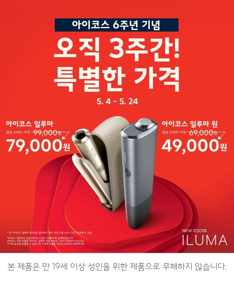 [서울=뉴시스]주동일 기자 = 한국필립모리스는 궐련형 전자담배 기기인 '아이코스(IQOS)' 출시 6주년을 맞아 3주간 아이코스 일루마와 아이코스 일루마 원을 2만원 할인한 특별가에 제공한다고 4일 밝혔다.