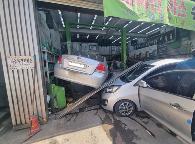 승용차는 여기서 멈추지 않고 인근 차량 정비소로 돌진해 차량 정비용 리프트를 들이받았으며, 이 충격으로 작업 중이던 60대 B씨가 다쳤다.
