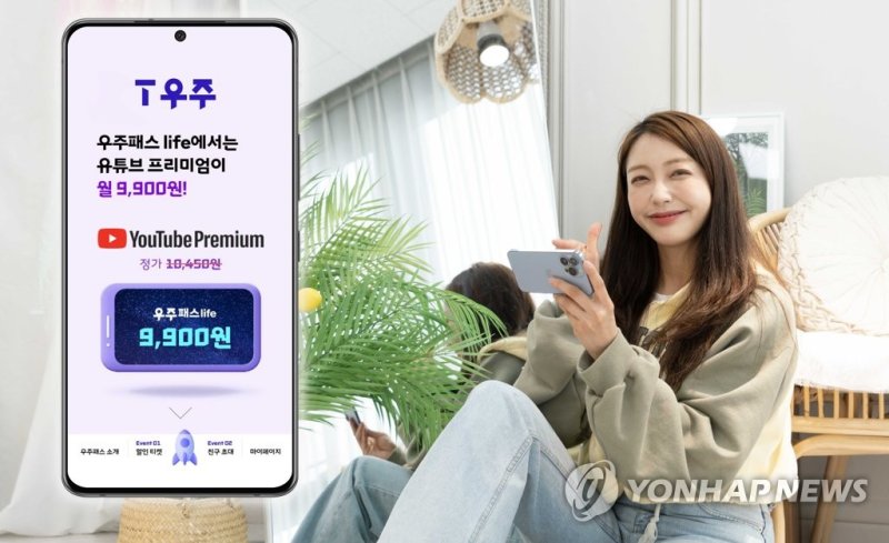 (서울=연합뉴스) 조성미 기자 = SK텔레콤[017670]은 "월 9천900원에 유튜브 프리미엄 구독과 세븐일레븐, 투썸플레이스 최대 30% 할인 혜택을 이용할 수 있어 경제적인 '우주패스 라이트(life)'를 출시했다"고 밝혔다.